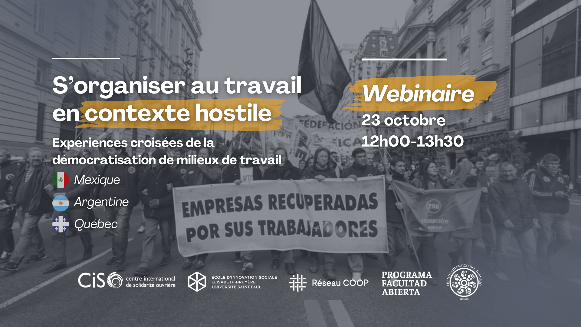 Le 23 octobre, à midi (12:00), nous vous invitons chaleureusement à une réflexion sur la portée sociale de la démocratisation des milieux de travail en Argentine, au Mexique et au Québec, dans un contexte marqué par la montée de la droite, voire de l’extrême-droite. Nous savons que l’organisation collective a le pouvoir d’engendrer une transformation sociale qui dépasse largement les seuls lieux de travail. Des initiatives concrètes d’organisation collective (coopératives, entreprises récupérées) issues de ces trois pays seront présentés par nos partenaires, le contexte de lutte plus ou moins intense dans lequel elles agissent ainsi que leur impact, parfois insoupçonné, dans les collectivités.